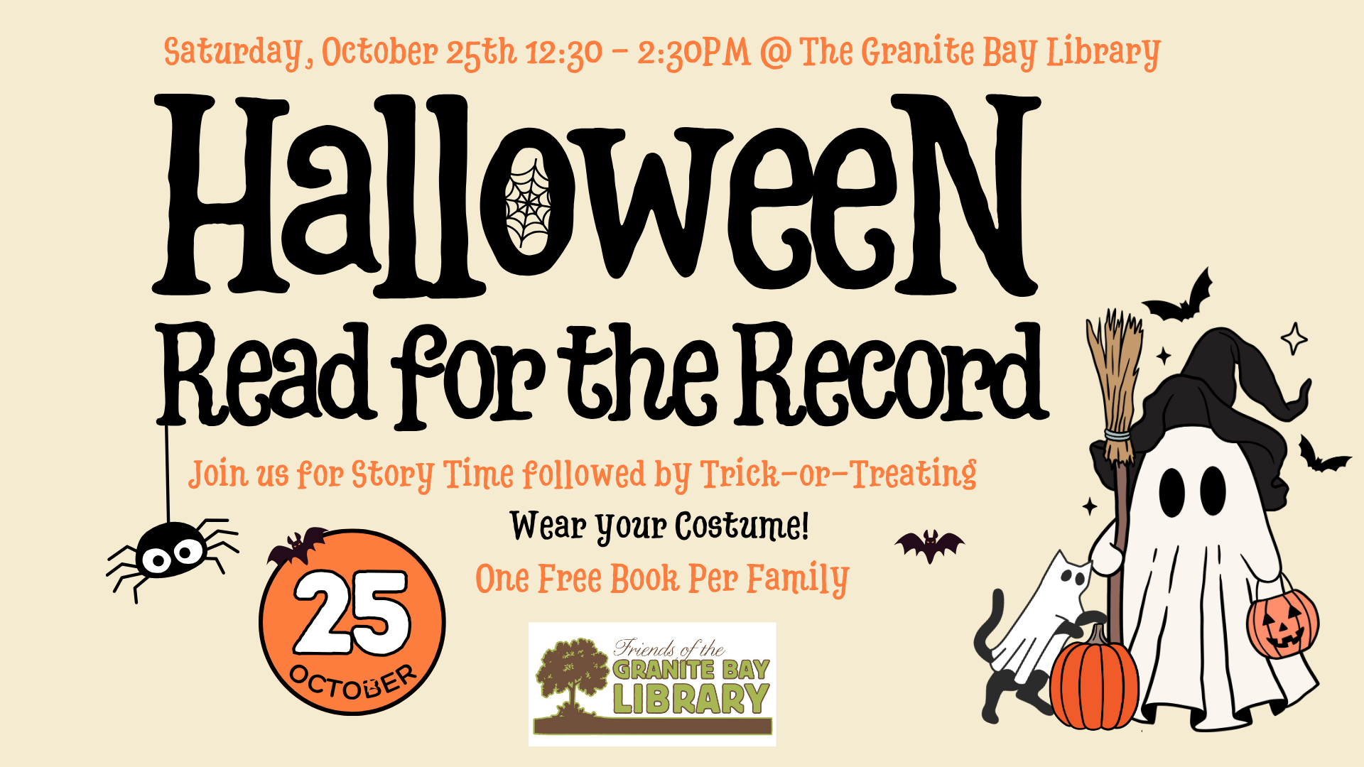 Join us for a Halloween Story Time that brings families together to read the same book on the same day, in communities all over the world. Our very own Granite Bay Librarian will be reading! Following the Story Time, we will Trick-or-Treat around the library grounds.